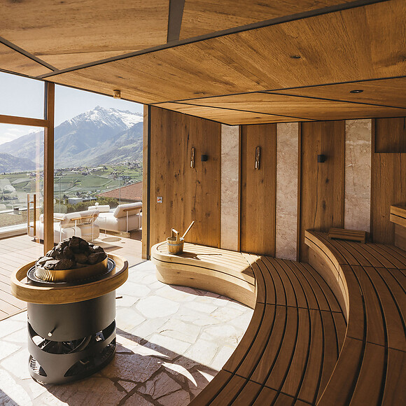 Wärme, Duft und tiefe Entspannung: Im zweiten Stock öffnet sich unsere großzügige Saunawelt für Erwachsene (textilfrei). Intensives Schwitzen und Entgiften erwartet Sie in der Tiroler Schwitzstube, sanfter geht es dagegen in unserer Biosauna “Ifinger” zu. Haut und Atemwege freuen sich besonders über einen Besuch im Rosendampfbad oder Soledampfbad. Dazu laden verschiedene Ruheräume zum Ankommen ein – jeder mit seiner eigenen Stimmung: der helle Panoramaruheraum mit Blick auf Schloss Schenna, der Dunkelraum für absolute Tiefenentspannung und unser Wohnzimmer, ein Ort zum Auftanken mit wärmenden Tees, hausgemachten Säften und Obst aus der nächsten Umgebung.