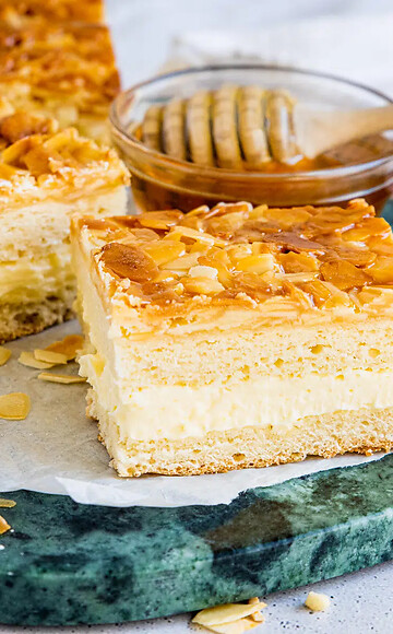 Den Teig mit der Bienenstichmasse bestreichen und nochmals gehen lassen, bis sich das Volumen beinahe verdoppelt hat. Dann bei 200 °C ca. 20 Minuten backen. Nach dem Abkühlen den Kuchen waagrecht halbieren und mit gesüßter Sahne füllen.