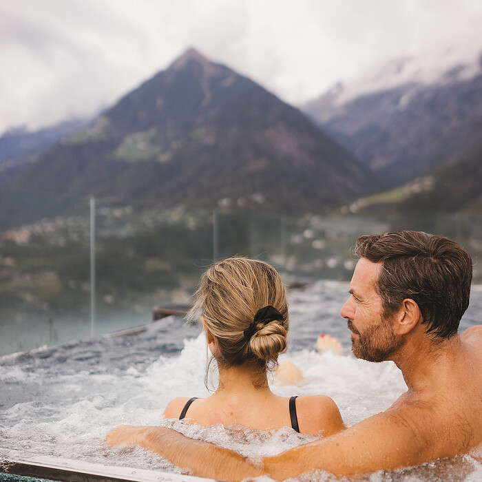Im FamilySpa, das allen offensteht, befinden sich der Indoorpool (30 °C) mit Sprudelbecken und Babybecken, sowie der 25 m Sportpool (28 °C) im Hohenwart-Garten. Auf der Dachterrasse, im Adults Only-Bereich, finden Sie unseren Panorama-Infinity-Solepool (34 °C) mit fantastischem Blick auf das Meraner Land.