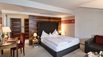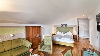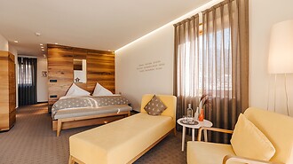 Das großzügig angelegte Doppelzimmer in warmen Farben und mit edlem Nussholz-Mobiliar sorgt für eine behagliche Atmosphäre. Es befindet sich in der Nähe von Restaurant, Bar und Rezeption. Mit zusätzlicher Schlafcouch dürfen sich seine BewohnerInnen ganz im Urlaubsglück fühlen. Einige dieser Zimmer sind mit Holzböden ausgestattet. Und vom Balkon aus kann man erholte Ferienblicke weit übers Etschtal schweifen lassen!