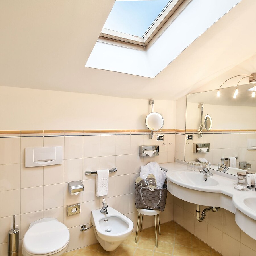 - Badezimmer mit Fenster, Doppelwaschbecken und Bidet