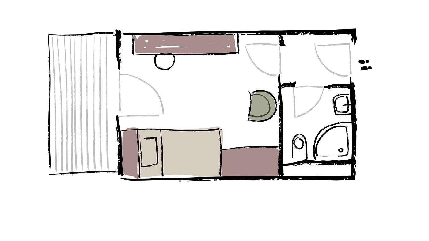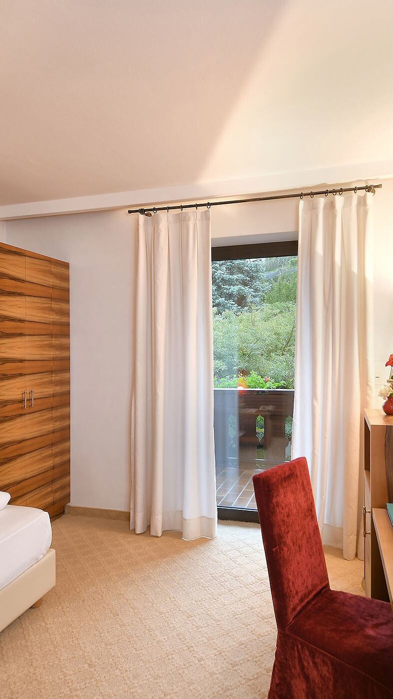 Das stilvolle Mobiliar aus Nussholz und elegante Stoffe in warmen Rottönen verleihen diesem Einzelzimmer einen edlen Wohlfühlfaktor. Zentral im Stammhaus gelegen und mit Blick auf den Ifinger fühlt man sich Bergabenteuern hier zum Greifen nah.
