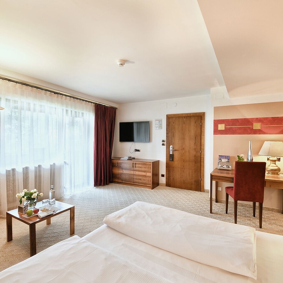 This double room with a balcony is located in the Main House and, with its view of the picturesque garden, is a small, private oasis of peace. Pleasantly warm colours and a well-thought-out room design, together with elegant walnut wood elements and selected fabrics, create a relaxed atmosphere.