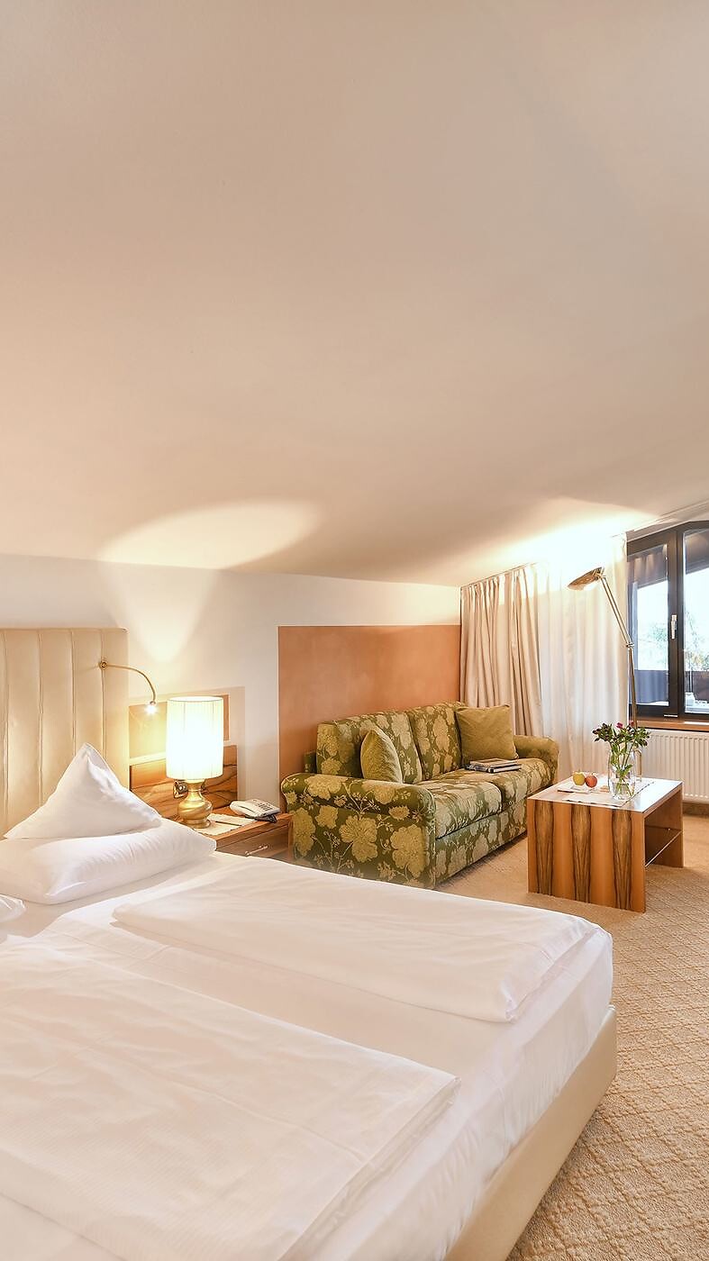 The Vernaun is a double room full of cosiness – with a pitched ceiling directly under the roof of the Main House. Selected, soft colours and stylish furniture lend the double room with balcony a relaxed feel, while the pull-out sofa bed invites you to daydream or sink your teeth into a good book.
