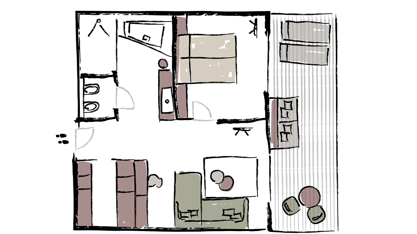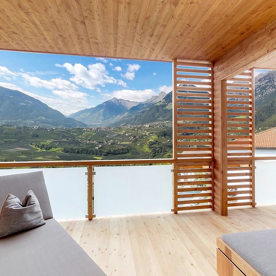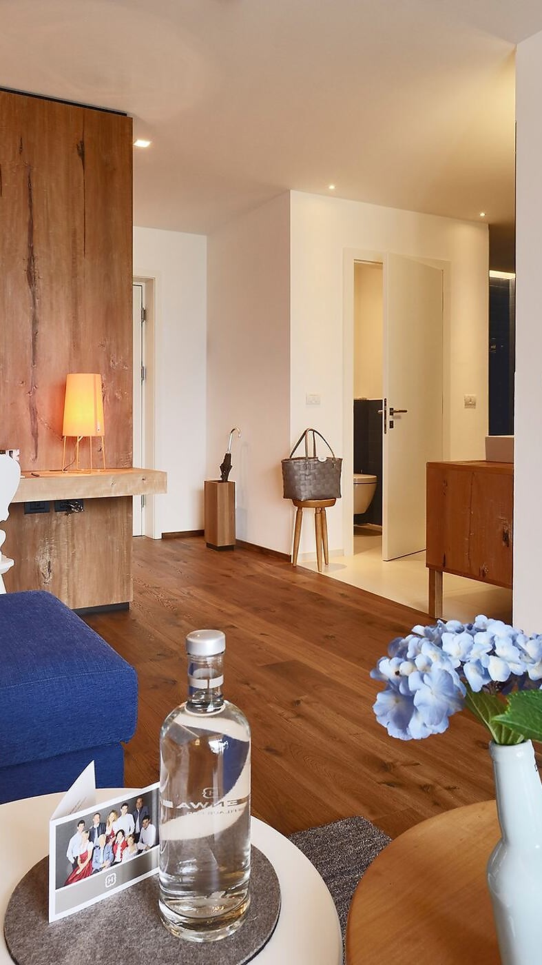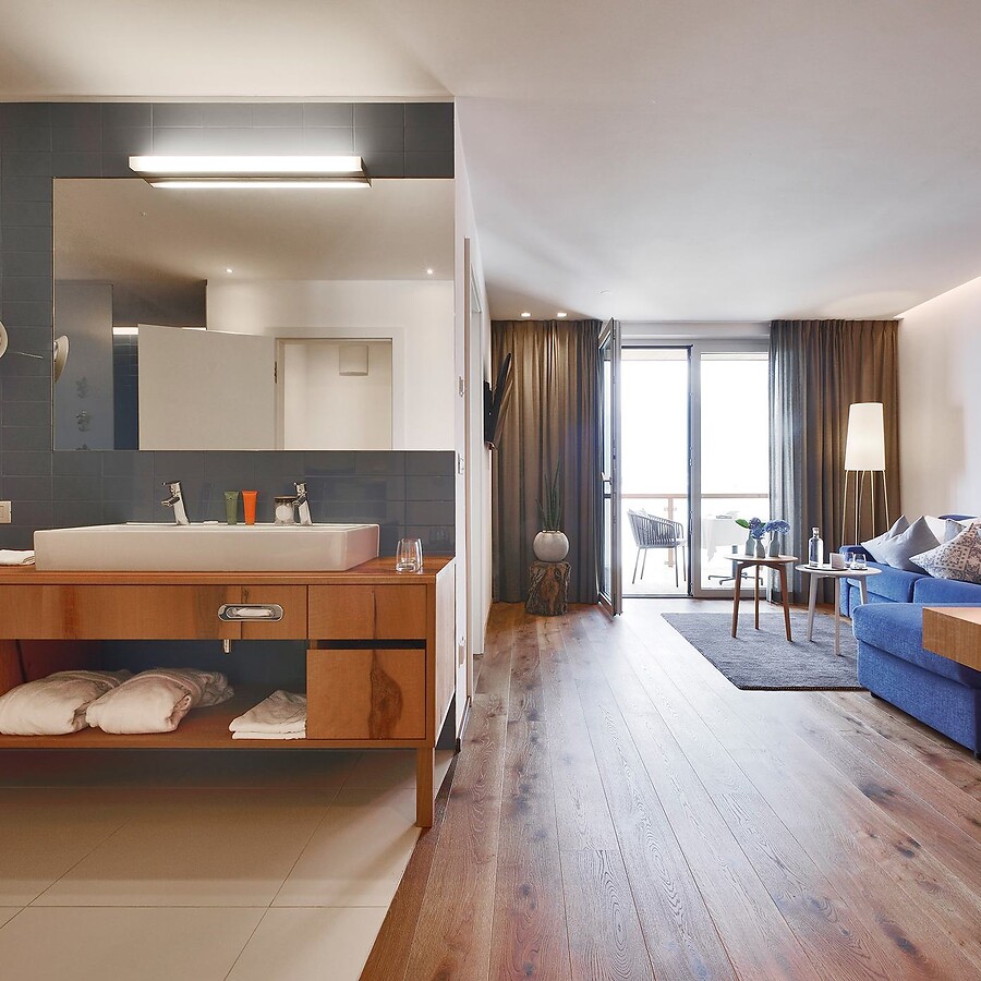 With a modern Alpine style, the charming living room, the light-flooded bedroom, the dressing room and the large, open bathroom with Swiss stone pine tub make holiday dreams come true. Traditional fabrics and furniture made of pear wood, a cosy sitting area and a large loggia with comfortable sun loungers invite you to unwind. Climate ceilings ensure a pleasant room temperature throughout the year. Dogs are not allowed in this suite.