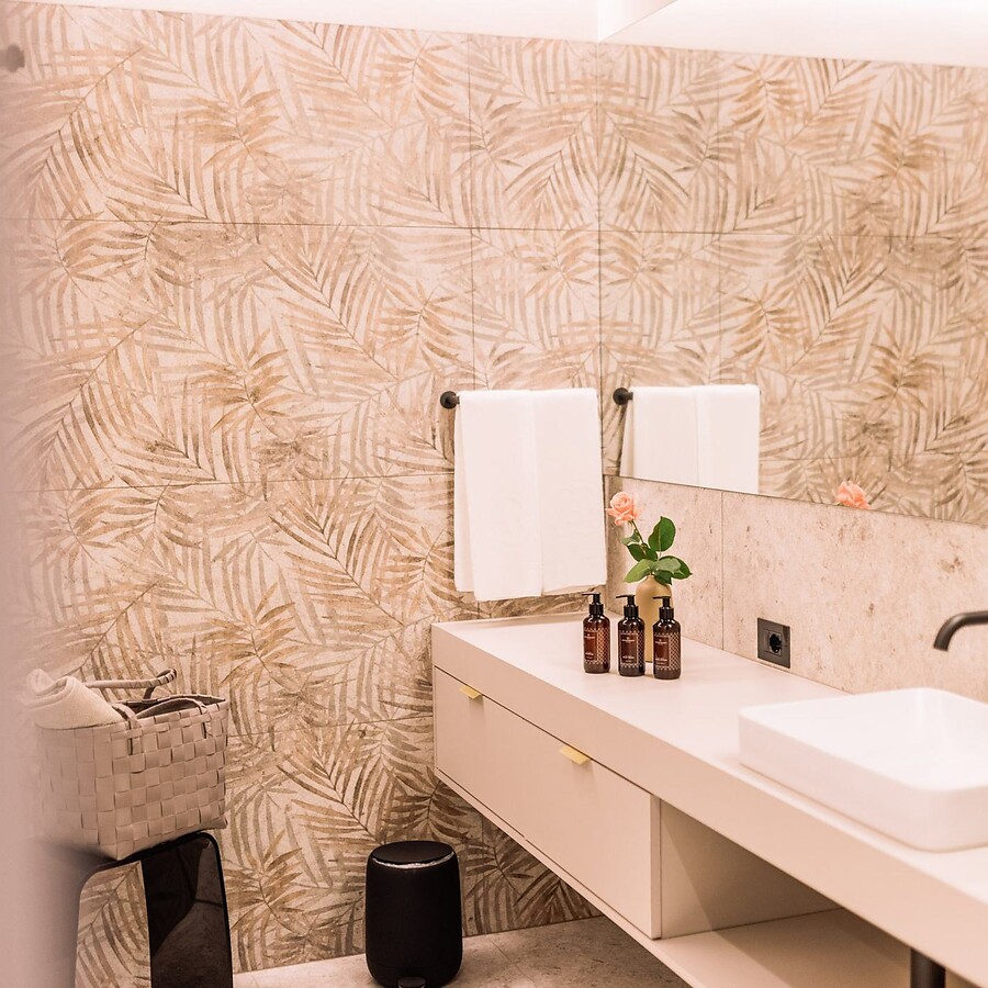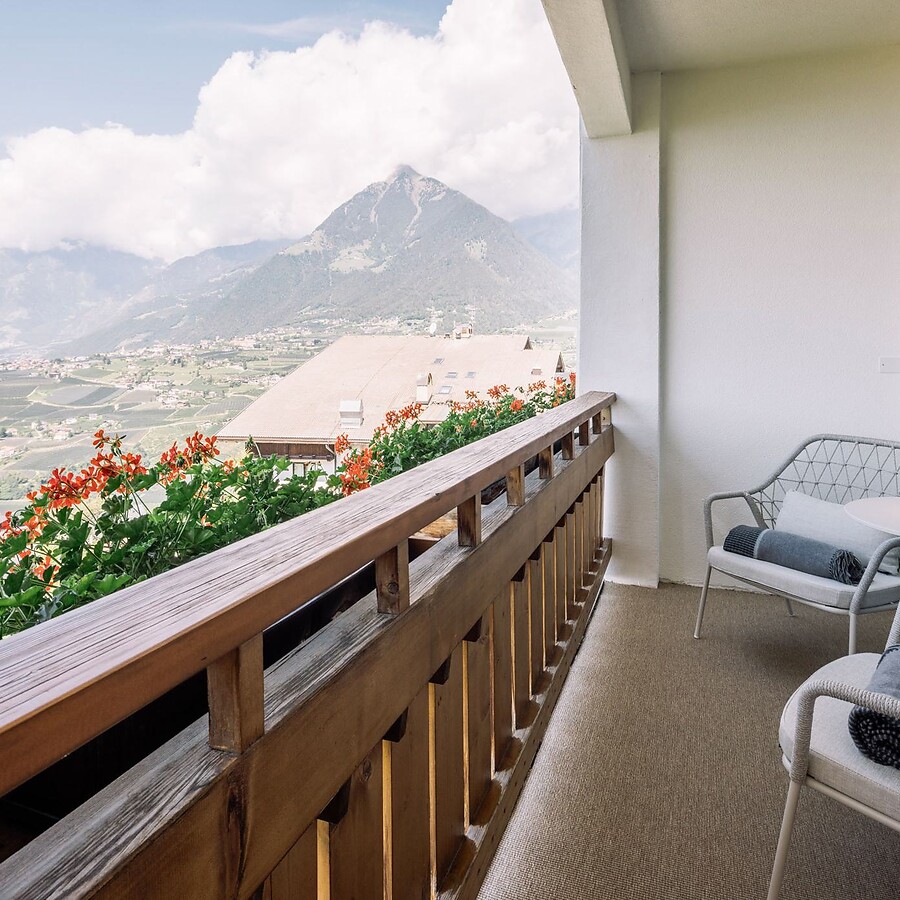 Modern furniture with calming mustard shades and natural tones, wooden floors and a well-thought-out lighting concept create a pleasant and relaxed atmosphere in this space. A highlight is the view from the comfortable beds across the balcony to the picturesque mountain landscape of South Tyrol. Innovative climate ceilings ensure pleasant temperatures all year round. Dogs are not allowed in this room.