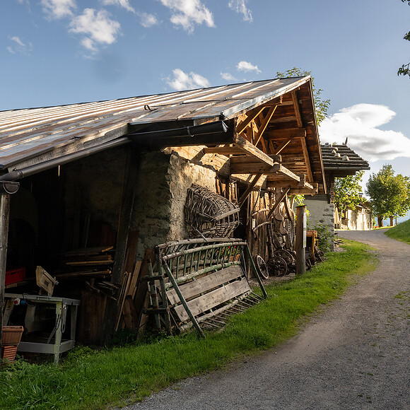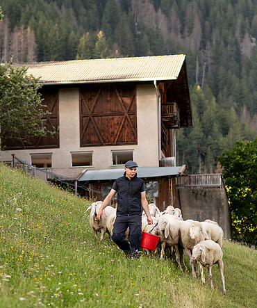 Around the Gasthof Gsteier inn you will find our sheep grazing, chickens scratching the ground and pigs playing in the mud. The fountain murmurs, the mill wheel turns, and in the garden grows everything that later finds its way onto your plate - at Hohenwart and, of course, when you visit the farm during a hike. Mr Mair regularly accompanies guests personally on a gentle walk from Egger to Gsteier. Those interested in culture and history should not miss a visit to the old barn, where over the years we have gathered an impressive collection of historic farming tools The farm museum is open and freely accessible at all times.