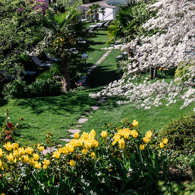 Our garden combines Mediterranean joie de vivre with Alpine garden culture. Lovingly cared for by Mrs Christine and Mrs Anna Mair, it has grown naturally over decades, developing into a spacious and diverse retreat. Here, everyone quickly finds their favourite spot, whether in the sun by the pool, in a quiet corner or sheltered in the shade beneath magnificent deciduous trees.