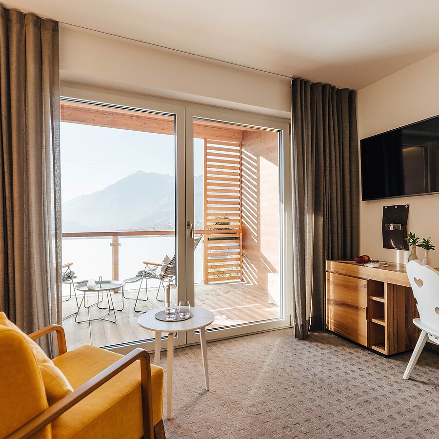 Una camera dal design moderno, impreziosita da elementi in legno di pero massiccio lavorato a mano, poltrone in stile retrò e accessori in feltro da produzione locale per un viaggio nella tradizione tirolese più autentica. L’ampia vetrata garantisce scorci mozzafiato sul panorama montano circostante. Con climatizzatore a soffitto per il massimo comfort in ogni stagione dell’anno.