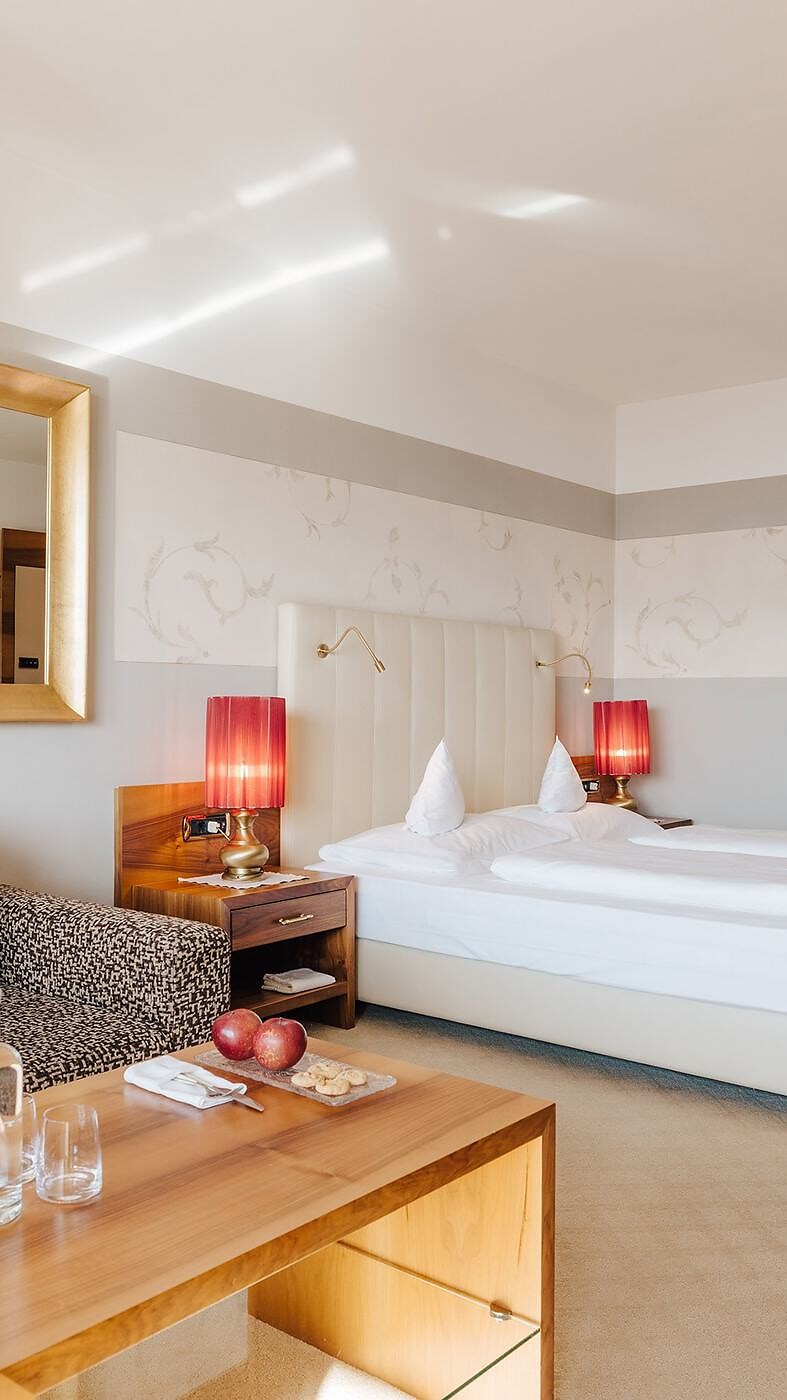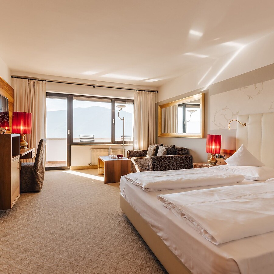 Posare le valigie e immergersi nel benessere, lasciandosi avvolgere dall’accogliente atmosfera degli interni con eleganti mobili in noce e delicate e calde tonalità di terra. Situata in posizione centrale nella Casa Principale dell’hotel, questa camera si trova a pochi passi dal ristorante, dal bar e dalla reception e offre un divano letto per bambini. Le camere di questa categoria sono in gran parte dotate di parquet. Il balcone è un meraviglioso palcoscenico che si eleva sopra un imponente teatro naturale, offrendo una vista mozzafiato su Tirolo e sulla Val Venosta.