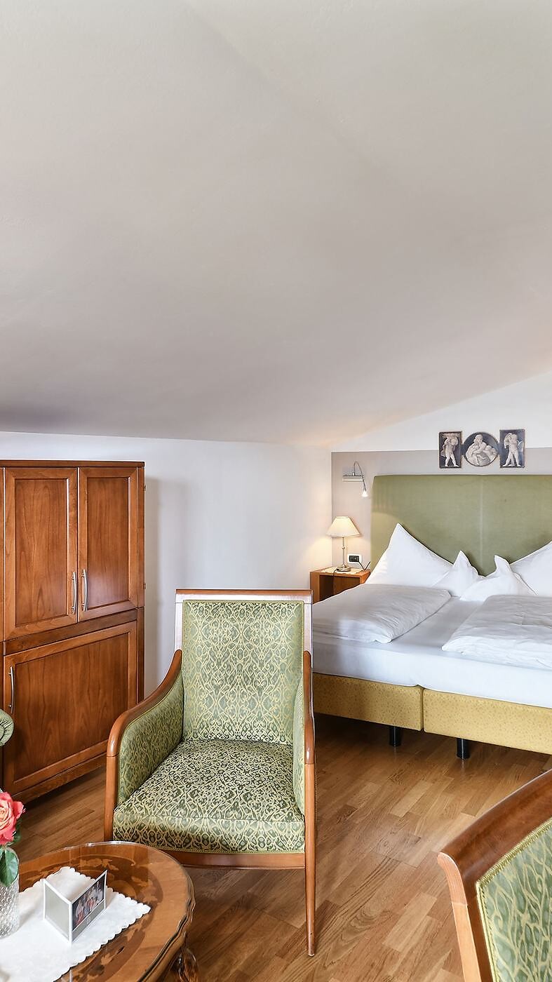 Una camera che invita a rilassarsi in un ambiente accogliente e a lasciarsi incantare dalla vista su Merano e dintorni. Pregiati mobili Made in Italy, il caratteristico soffitto spiovente, un’ampia cabina armadio e il pregiato parquet donano a questo ambiente un comfort accogliente e di puro benessere.