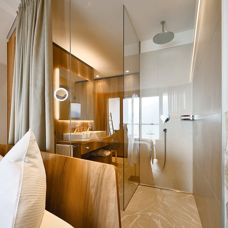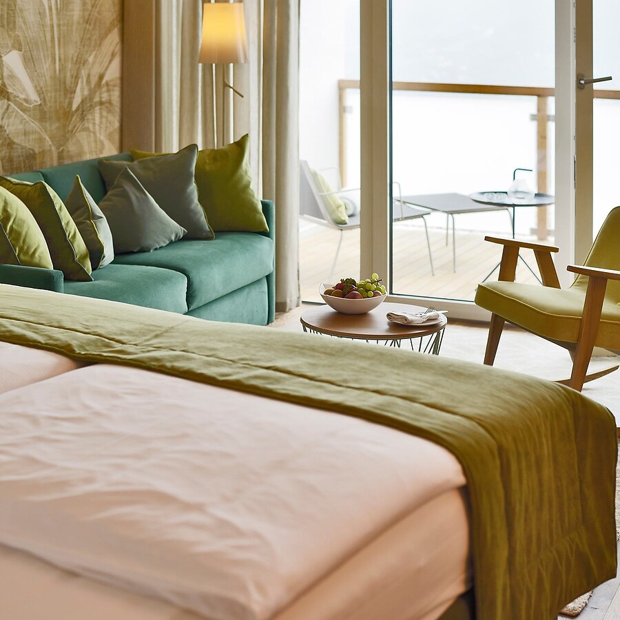 Un’affascinante camera con open space per area letto e soggiorno, arredata con pregiati mobili e pavimenti in legno, un’atmosfera dalle fresche tonalità di verde. Un’esperienza ricca di benessere, perfezionata dalla presenza di un ampio balcone con lettini dal design moderno. La stanza da bagno è dotata di lavandino doppio e di un’ampia vetrata con vista panoramica sulle vette circostanti. I moderni climatizzatori a soffitto assicurano temperature gradevoli nei mesi freddi e un piacevole fresco durante l’estate. I cani non sono ammessi.