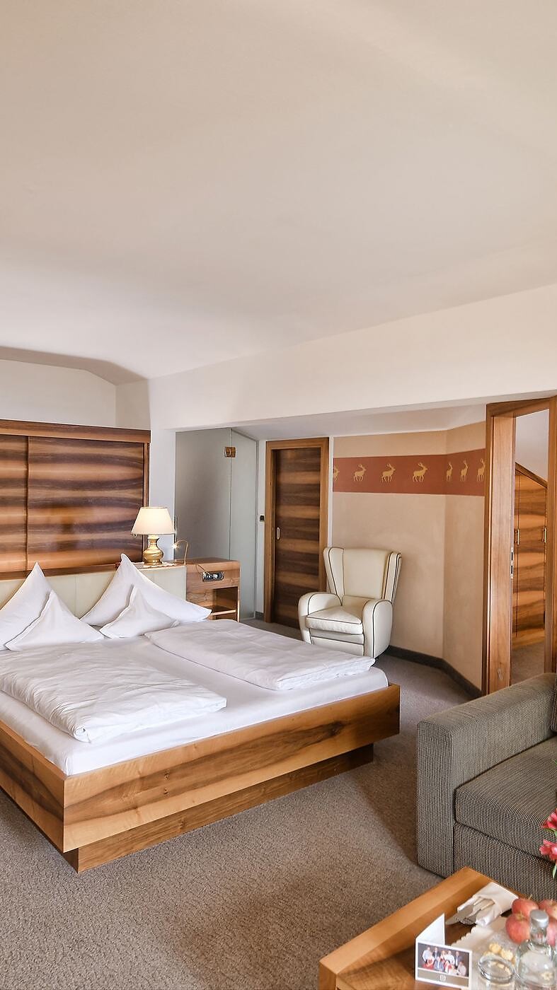 La Rubein Suite si trova all’ultimo piano della Casa Principale e incanta sia per gli ampi spazi che per il balcone con vista panoramica. I mobili in noce, i materiali dalle calde tonalità di terra e la generosa disposizione degli spazi donano alla suite una ricercata eleganza. Dotata di un letto matrimoniale nella camera principale, di un’ampia cabina armadio e di una seconda stanza con un letto alla francese, la suite offre il giusto spazio per il vostro relax prima di affrontare nuove avventure!