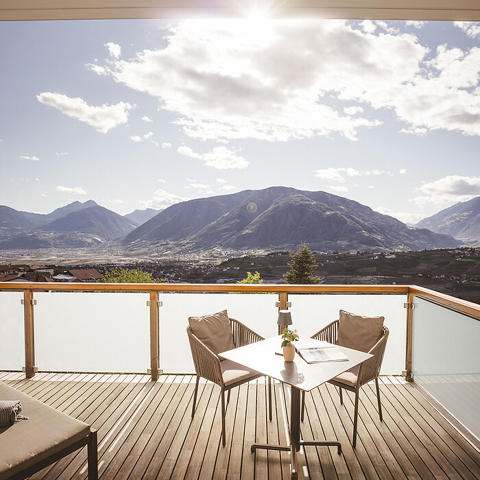 Sì. Ad eccezione di alcune unità singole, tutte le nostre camere e suite a Merano dispongono di un balcone in vetro, in legno o in muratura tradizionale, o persino di un’ampia terrazza o loggia dove godersi il sole. La vista si affaccia direttamente sul verde e spazia fino a Merano e sulle montagne circostanti.